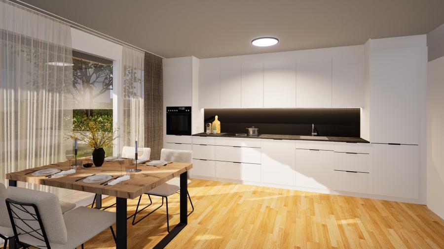 Alle Wohnungen verfügen über eine hochwertige Einbauküche mit weißen Fronten, schwarzer Griffleiste und deckenhoher Ausführung. Die Naturstein-Arbeitsplatte „Black Natur“ im Leather-Look setzt einen eleganten Akzent. Markengeräte von Bosch sowie ein Kochfeld mit integriertem Umluftabzug von Bora sorgen für modernen Komfort. LED-Beleuchtung, flächenbündige Unterbauspüle und durchdachte Stauraumlösungen unterstreichen das gehobene Niveau.