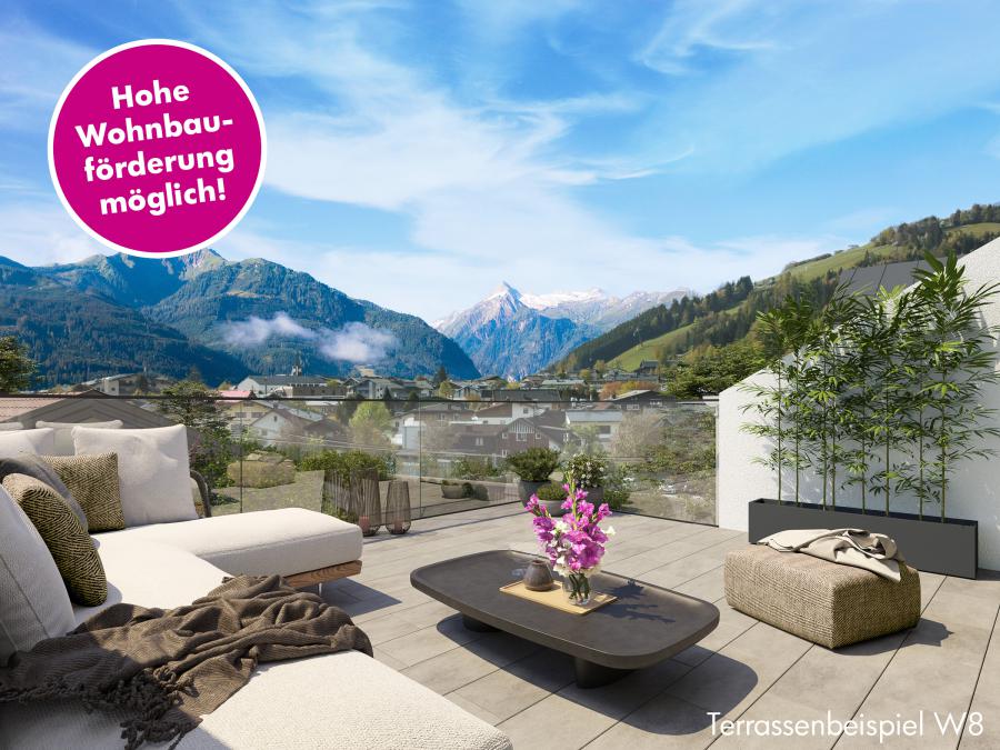 Highlight des Projekts ist diese exklusive Dachgeschosswohnung mit zwei Panoramaterrassen mit Blick auf den Kitzsteinhorngletscher und auf die umliegende Bergwelt. Mit dem Lift gelangen Sie bequem vom Erdgeschoss bis vor Ihre Wohnung. Das Herzstück stellt der lichtdurchflutete rund 49 m² große Wohn- und Kochbereich dar, der den Blick auf die wunderschöne Panoramaaussicht nochmals freigibt. Die beiden Terrassen mit ca. 38 m² bietet eine Vielzahl an Gestaltungsmöglichkeiten für eine individuelle Wohlfühloase.