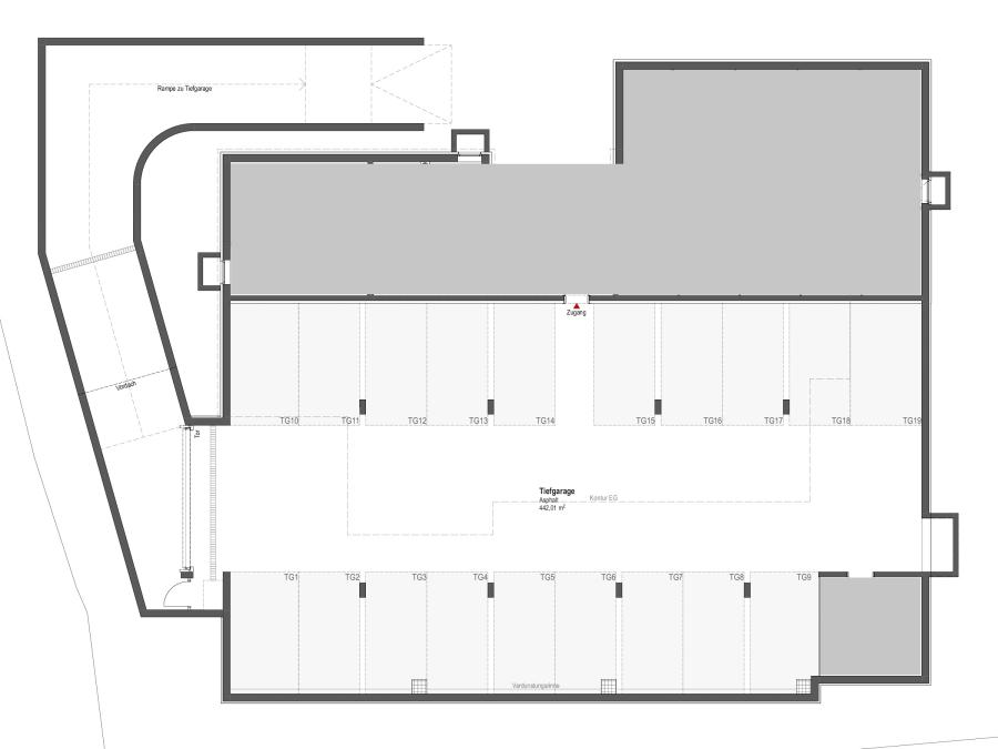 Die Tiefgarage ist gut befahrbar und sehr gut beleuchtet. Das elektrisch betriebene Rolltor lässt sich mittels Fernbedienung oder Schlüssel öffnen.