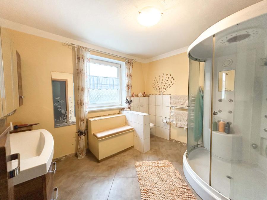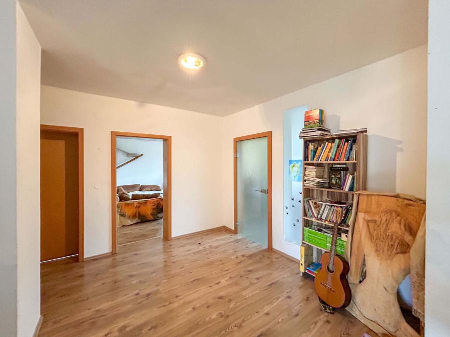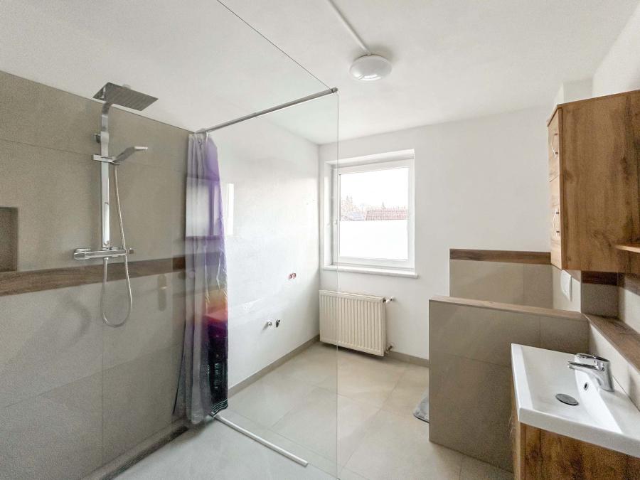 Im Obergeschoss erwarten Sie ein großzügiger Vorraum, ein Wohnbereich mit Balkon, drei Schlafzimmer sowie ein Küchenbereich mit allen Anschlüssen. Das Badezimmer wurde 2025 hochwertig saniert und bietet modernste Ausstattung mit Regendusche.